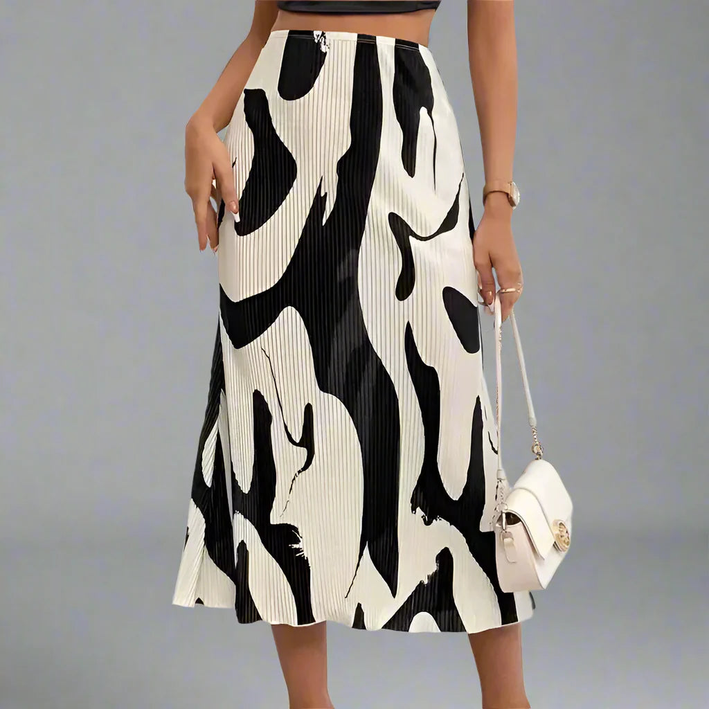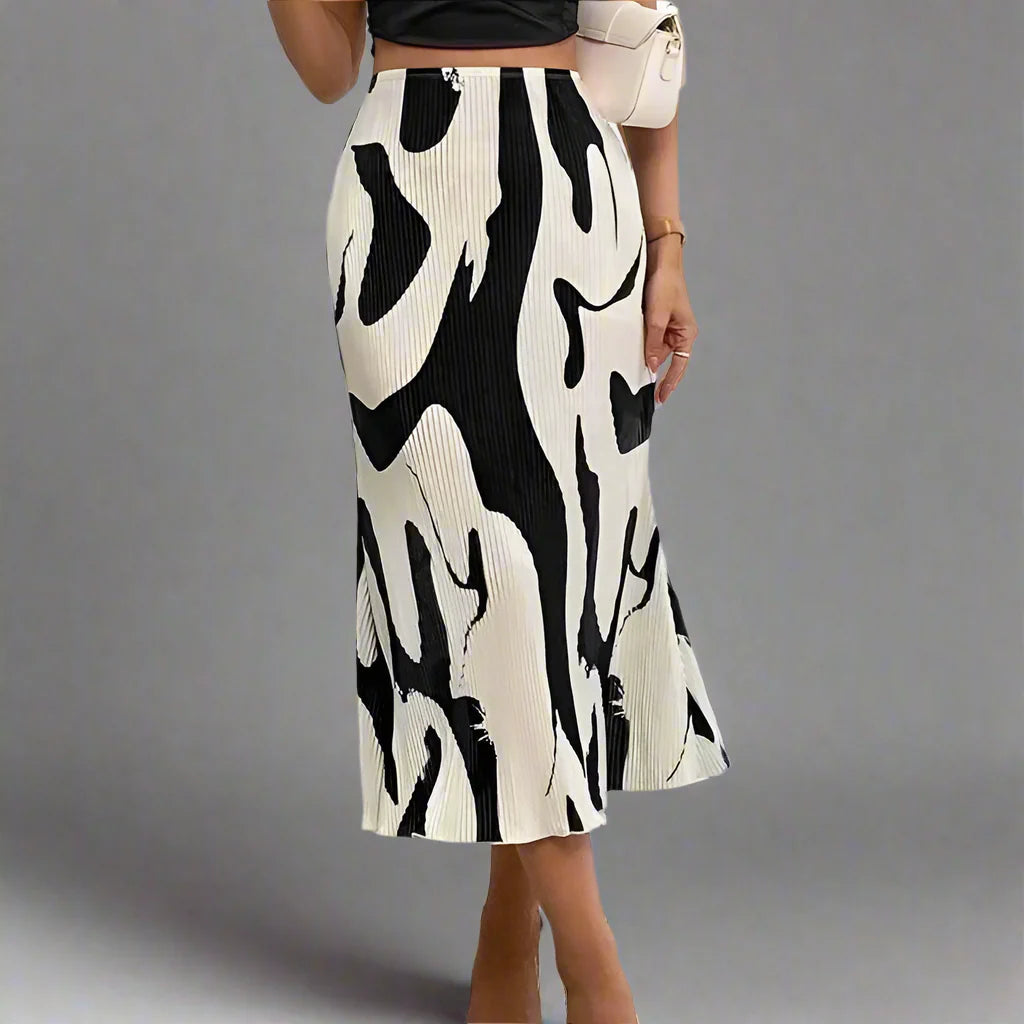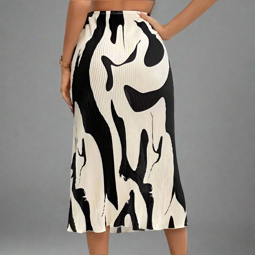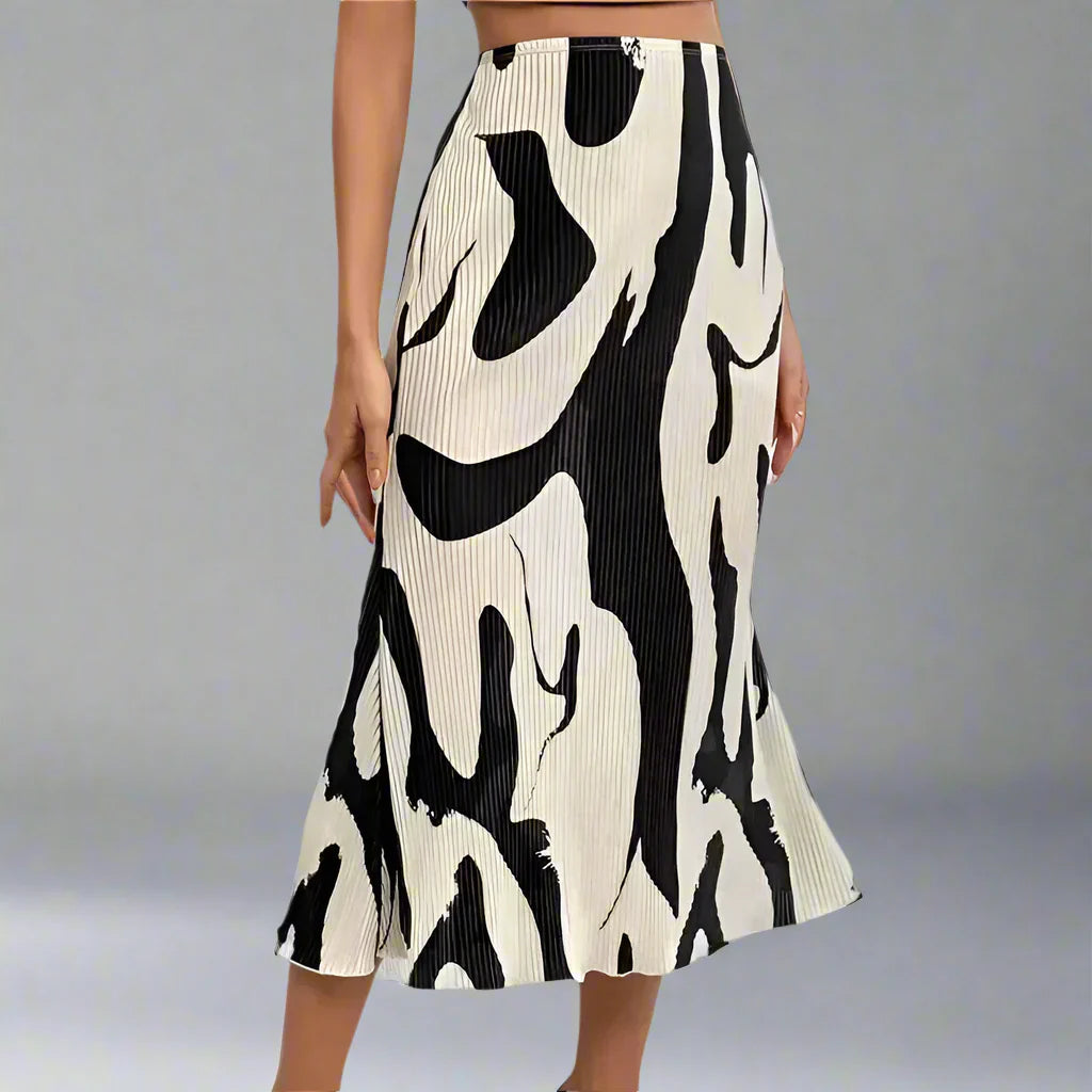 Designed with a distinctive black and white abstract motif over a soft pleated contour, our Astoria Studio Skirt is an artful assertion to your wardrobe. High rise waist and graceful flow accentuate your curves with a modern aesthetic.