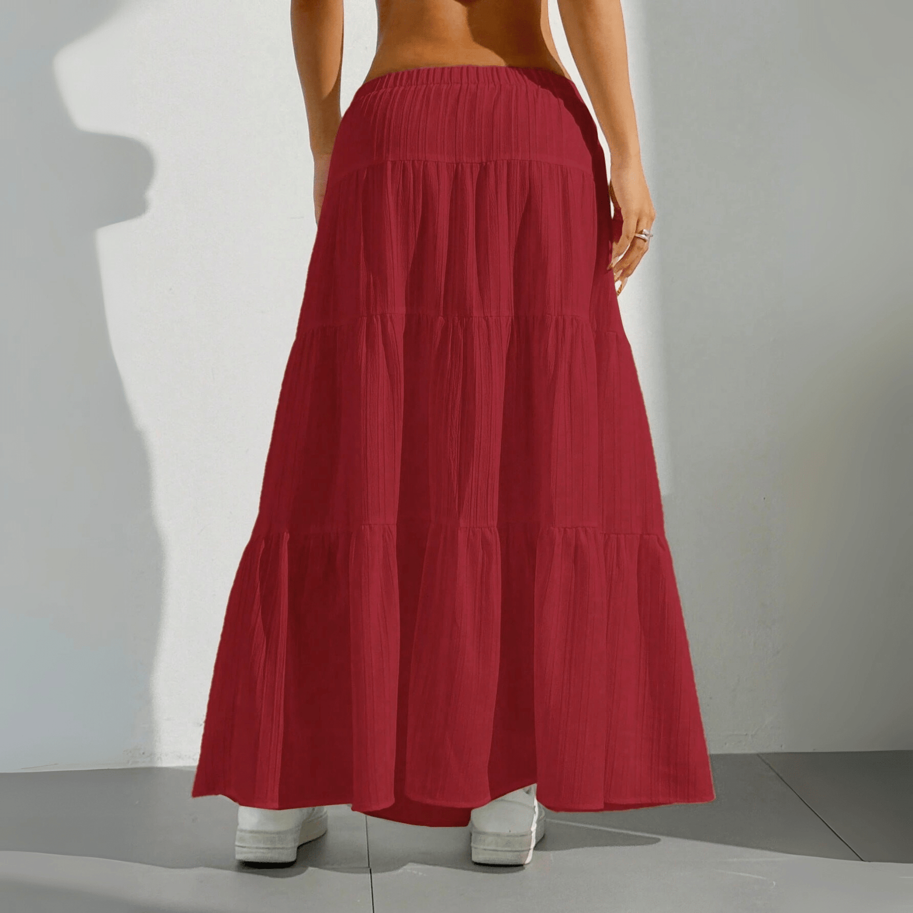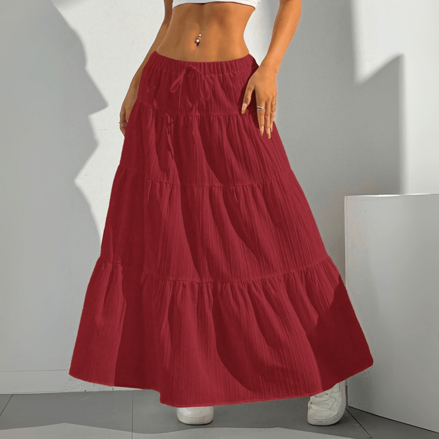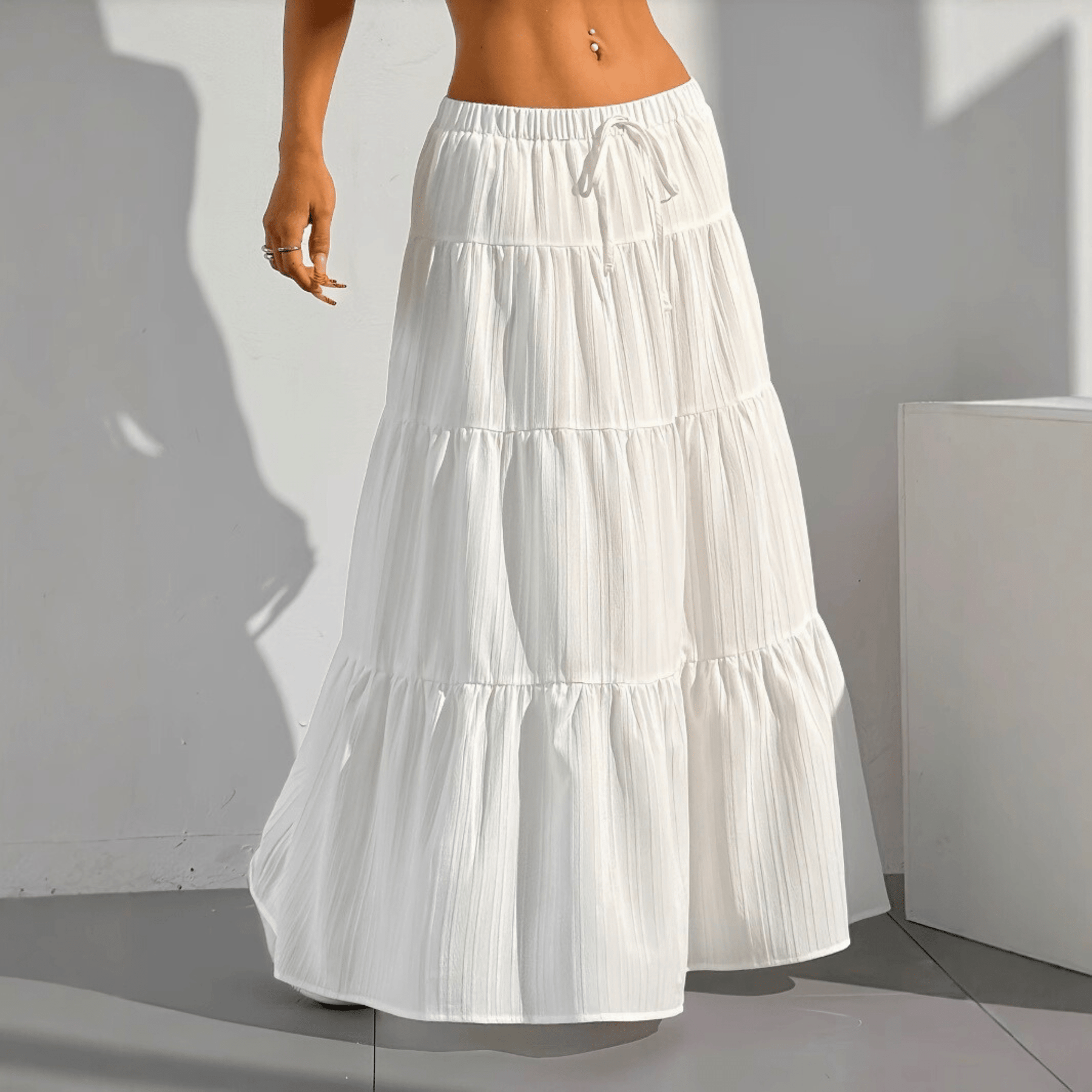 Float through your day — featuring a tiered silhouette, soft breathable fabric, and an adjustable drawstring waist for the perfect fit. Designed for comfort and versatility, this flowing maxi skirt transitions seamlessly from sunny strolls to chic summer evenings.