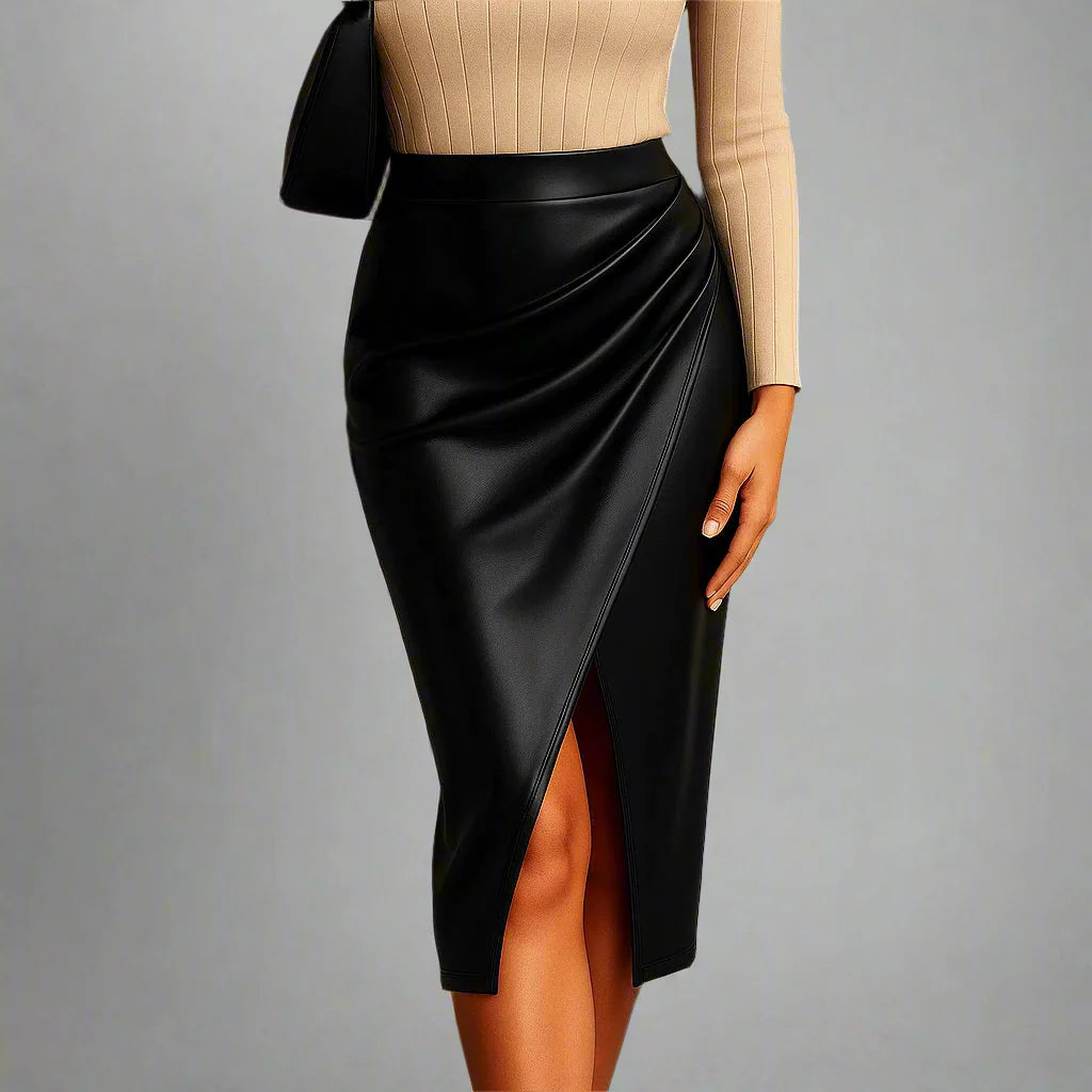 Sleek, sculpted, and unmistakably chic, our SoHo Contour Skirt is tailored from supple vegan leather that hugs every curve with precision. The artfully draped wrap front and Signature SoHo asymmetric slit create quite the statement piece.  Smooth finish with modern colorways make it a bold staple from desk to downtown.