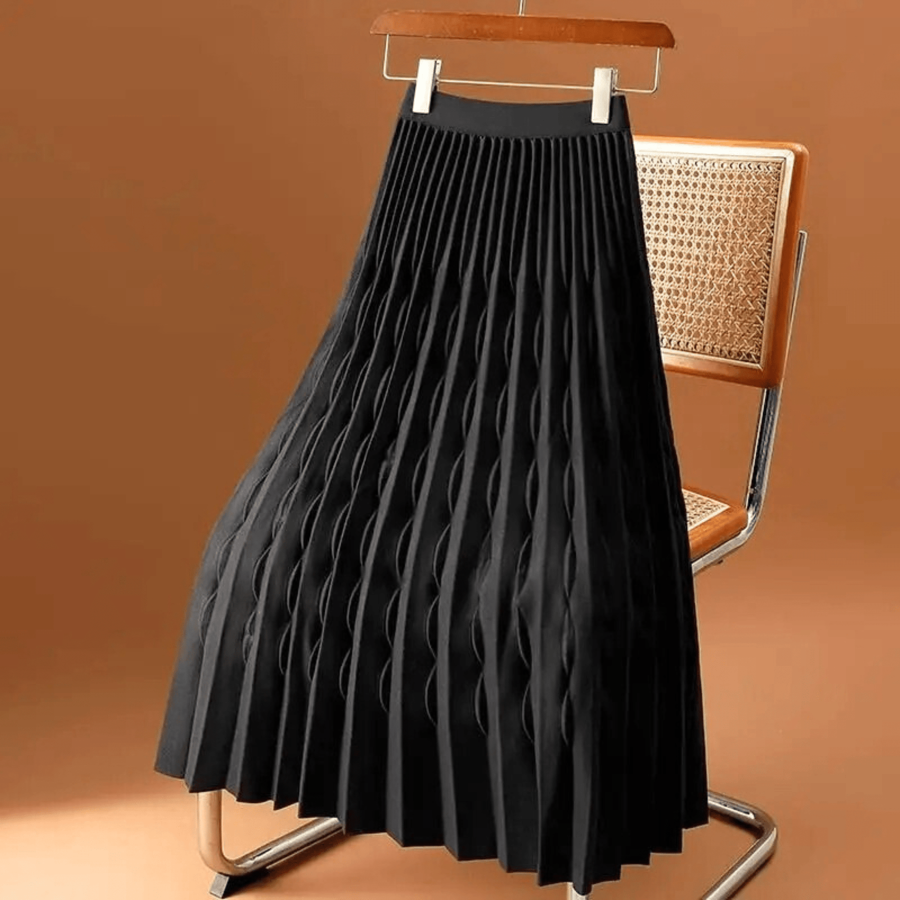 Crafted from a premium mid-weight knit, featuring sculpted 3D pleats that create a graceful A-line silhouette. With its high-waisted elastic fit and soft textured finish, it blends elegance with cozy warmth for the colder seasons.
