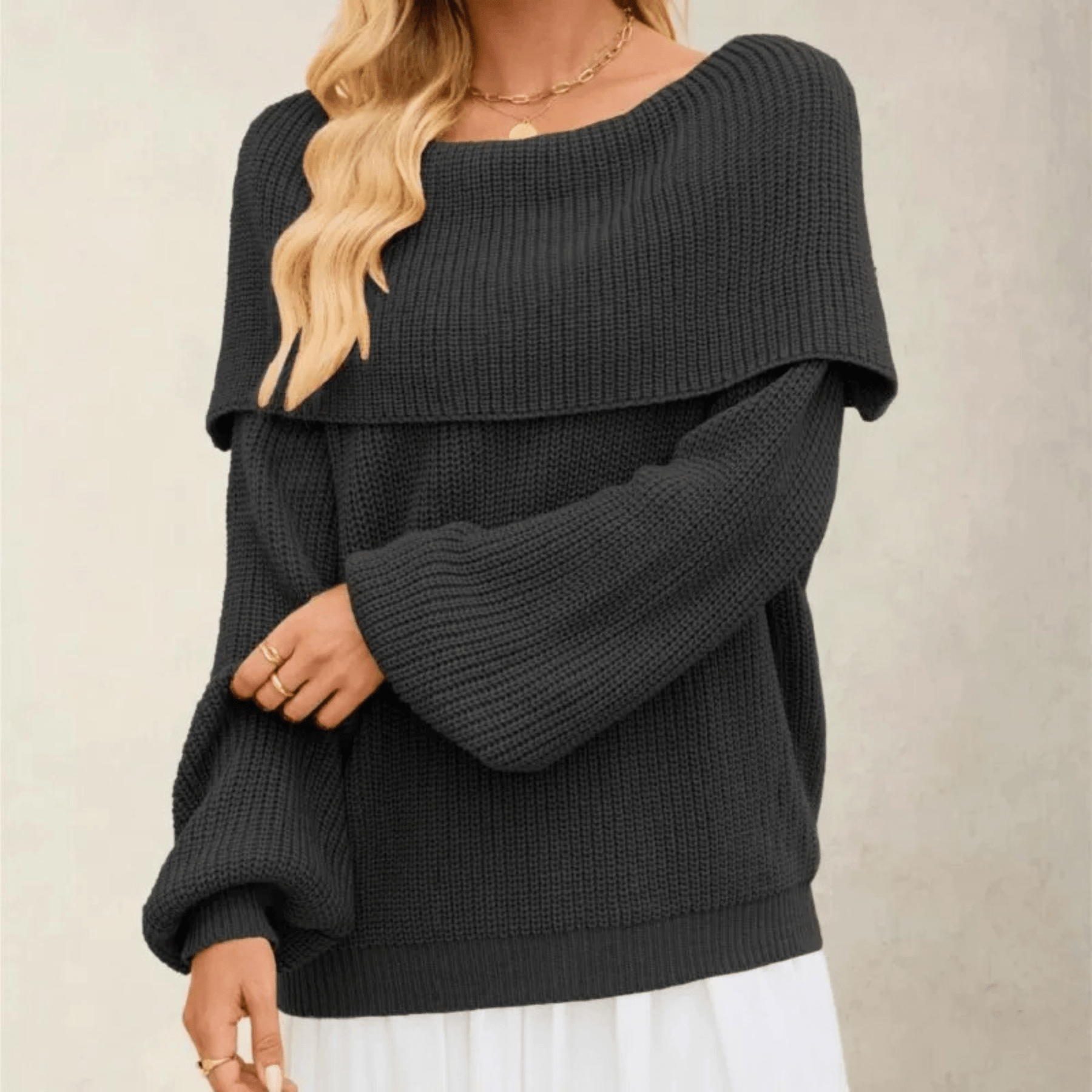 Featuring a folded wide collar with a relaxed off-shoulder structure, this sweater is crafted in a chunky rib-knit texture that drapes naturally. Designed for effortless layering or wearing solo, it’s a versatile fall and winter essential.